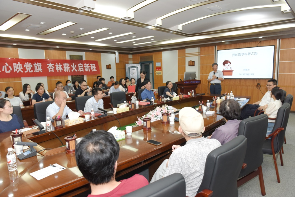 活动伊始,肖献忠教授登台为支部党员和在场师生带来 “我的医学科普之路” 主题讲座。他以深厚的学术积淀与真挚的教育情怀,系统回顾了在病理生理学领域的深耕历程,深刻阐释了学科发展的脉络与未来方向,为师生们提供了宝贵的学术启迪。肖教授重点分享了退休后矢志投身科普事业的初衷、历程与收获,通过多元渠道将高深的医学知识转化为惠及大众的科学养分,致力于破除专业壁垒,提升全民健康素养,用通俗易懂的语言揭开医学神秘面纱,生动展现了一位老党员、老学者的赤诚情怀与奉献精神,其科普作品的创作过程和传播成果引发了学生们对医学科普事业的浓厚兴趣与深入思考。整场讲座如一堂生动党课,让在场师生深刻领悟党员责任担当以及在医学领域探索、传承创新的重要性。