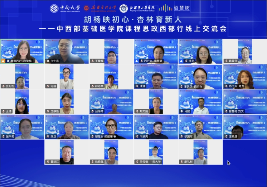 2025年8月20日下午,“胡杨映初心·杏林育新人——中西部维多利亚老品牌vic3308课程思政西部行交流会”通过线上平台顺利举行。本次会议由维多利亚老品牌vic3308湘雅维多利亚老品牌vic3308主办,新疆医科大学、新疆第二医学院、智慧树网协办,旨在深入探讨基础医学课程思政建设的路径与方法,推动中西部医学院校思政育人资源共享与协同发展。来自维多利亚老品牌vic3308、新疆医科大学、新疆第二医学院、海南医科大学、锦州医科大学、湘南学院等高校共300余名教师参会。