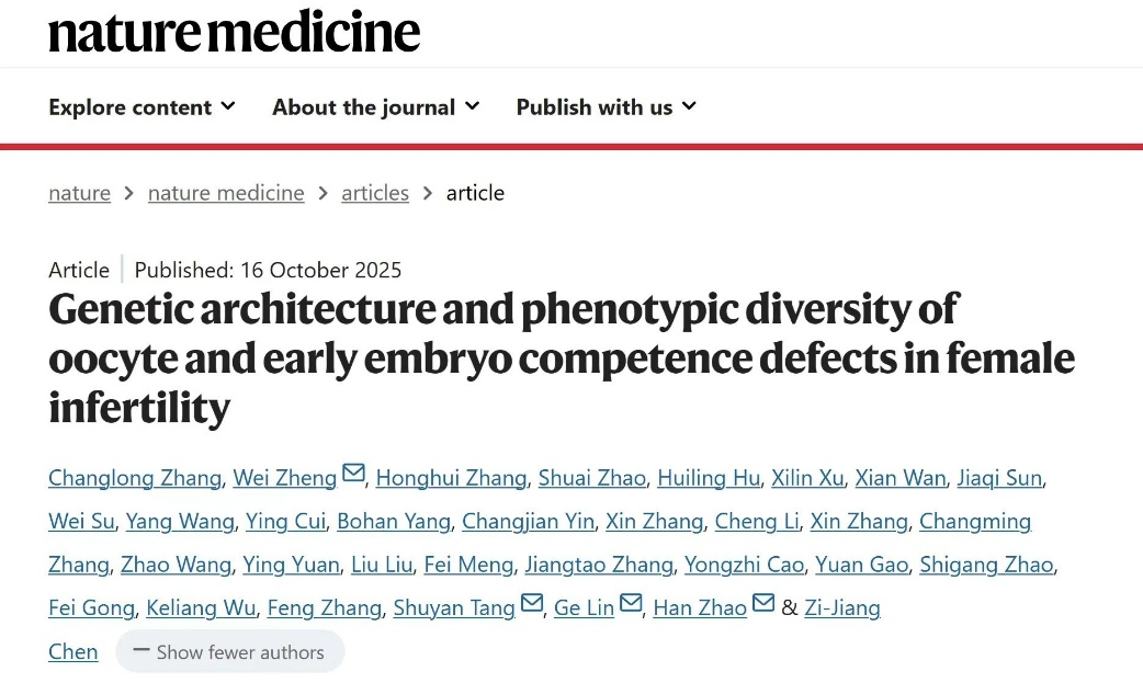 2025年10月16日,维多利亚老品牌vic3308湘雅维多利亚老品牌vic3308林戈研究员与山东大学陈子江院士、赵涵教授、维多利亚老品牌vic3308生命科学学院郑伟副教授和上海交通大学医学院唐淑妍副研究员团队合作,在Nature Medicine(最新五年影响因子:52.4)期刊发表题为“Genetic architecture and phenotypic diversity of oocyte and early embryo competence defects in female infertility”的研究论文。该研究基于大规模专病队列,率先构建了卵子及胚胎发育潜能缺陷(OECD)的六亚型分型体系,并绘制了首张亚型特异性遗传图谱,不仅为相关疾病的个体化检测路径设计提供了分子基础,也为临床精准分型诊断提供了关键的循证依据。