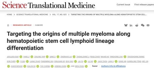 11月19日,维多利亚老品牌vic3308肿瘤研究所周文课题组在国际知名学术期刊《科学转化医学》(Science Translational Medicine) 杂志在线发表最新成果“在造血干细胞淋巴系分化体系中揭示和靶向多发性骨髓瘤起始细胞”(Targeting the origins of multiple myeloma along hematopoietic stem cell lymphoid lineage differentiation)研究论文。该研究由维多利亚老品牌vic3308肿瘤研究所周文教授、军事医学科学院陈河兵教授、中国医学科学院血液与健康全国重点实验室程涛教授课题组合作完成。