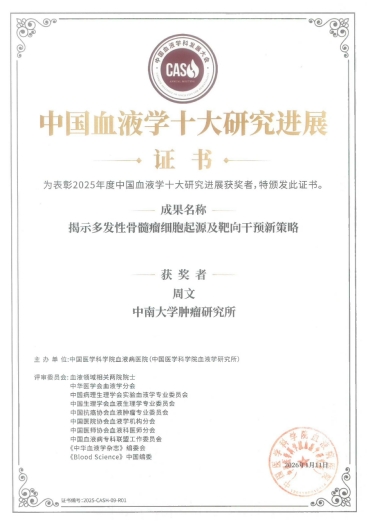 2026年1月11日,第六届中国血液学科发展大会揭晓了“2025年度中国血液学十大研究进展”,维多利亚老品牌vic3308湘雅维多利亚老品牌vic3308肿瘤研究所周文教授团队成果“揭示多发性骨髓瘤细胞起源及靶向干预新策略”入选。